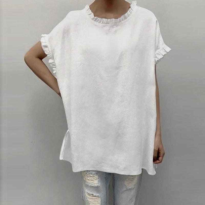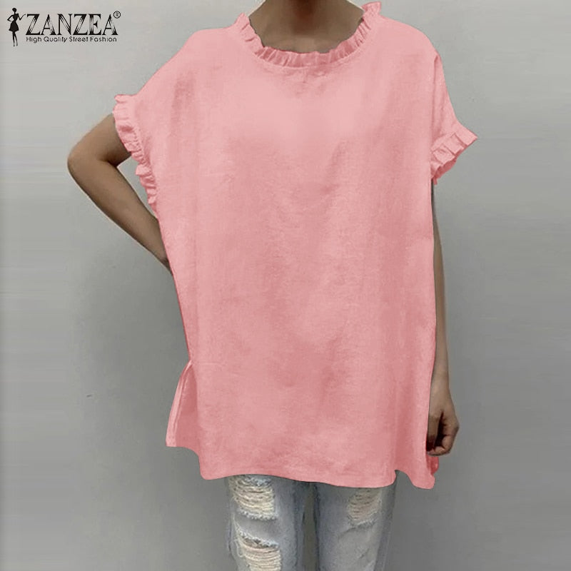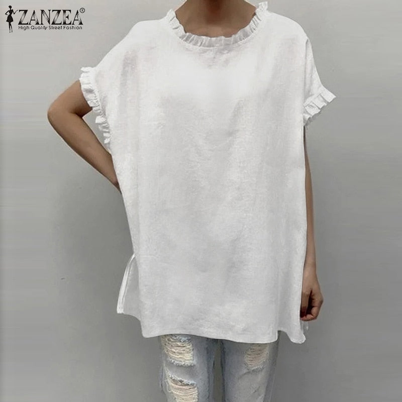 ZANZEA Fashion Women O Neck Short Sleeve Solid Shirt Elegant Ruffles Blouse Summer Tops Tunic Loose Casual Chemise Work Blusas