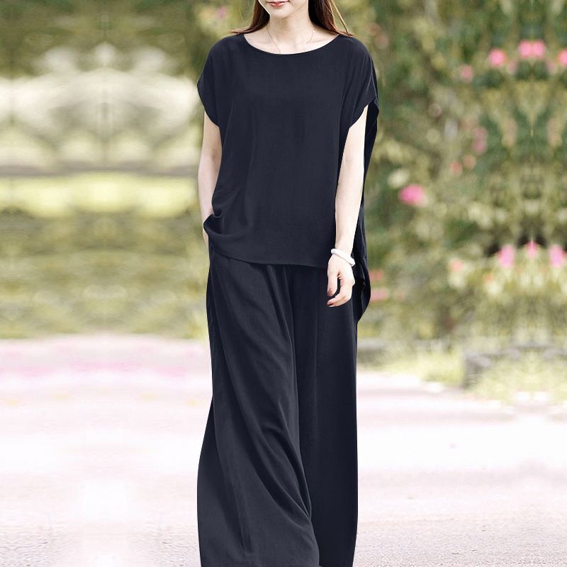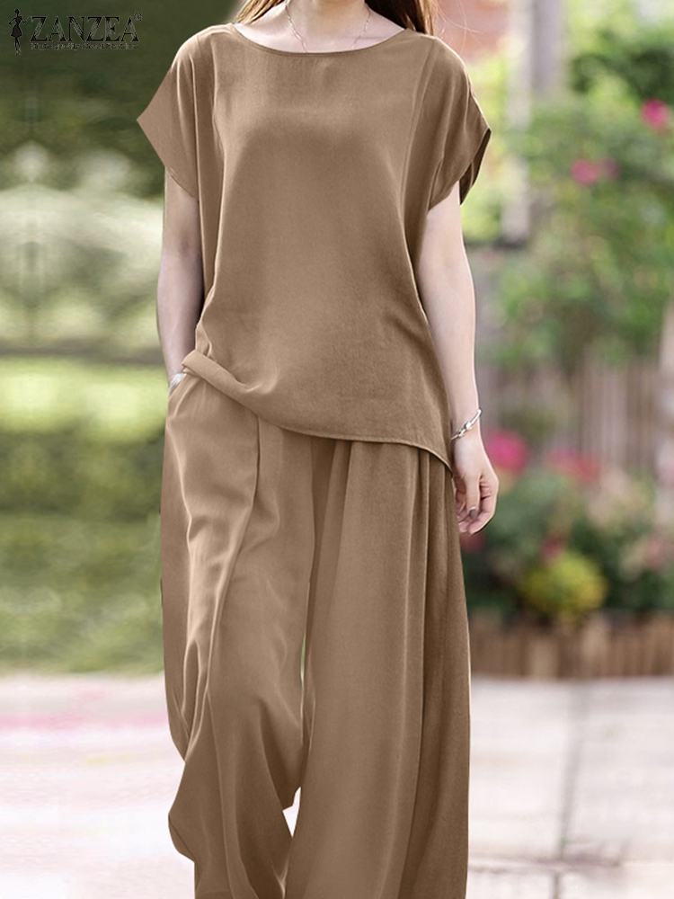 ZANZEA Oversized Summer Trousers Suits 2PCS Women Matching Sets Fashion Short Sleeve Blouse Wide Leg Pants Sets Loose Tracksuit