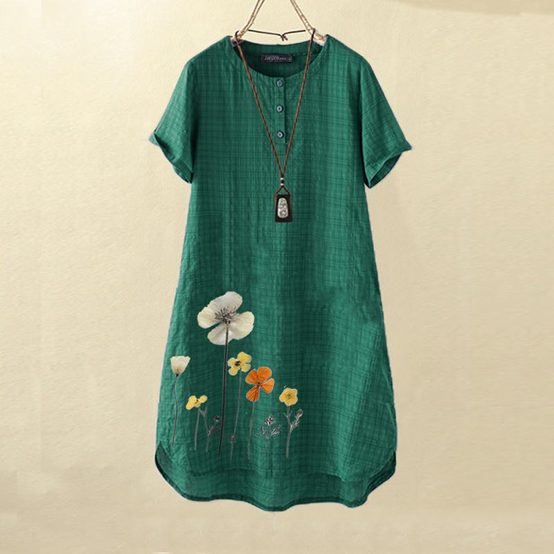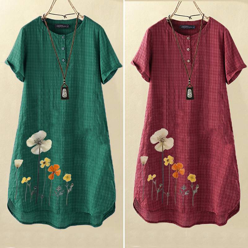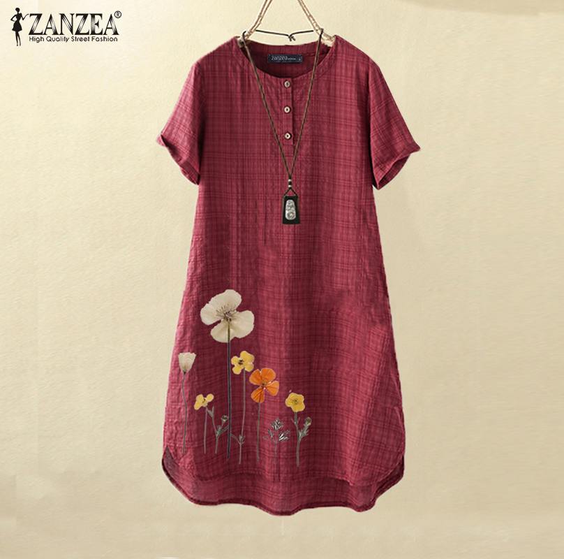 ZANZEA Summer Floral Printed Dress Women Vintage Plaid Checked Short Sleeve Sundress Casual Beach Vestido Kaftan
