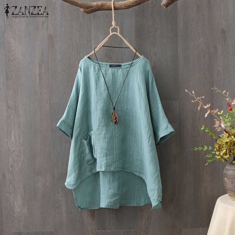 ZANZEA Summer Half Sleeve Cotton Linen Blouse Women Tunic Tops Casual Loose Vintage Blusas Femininas  Solid Work Shirt