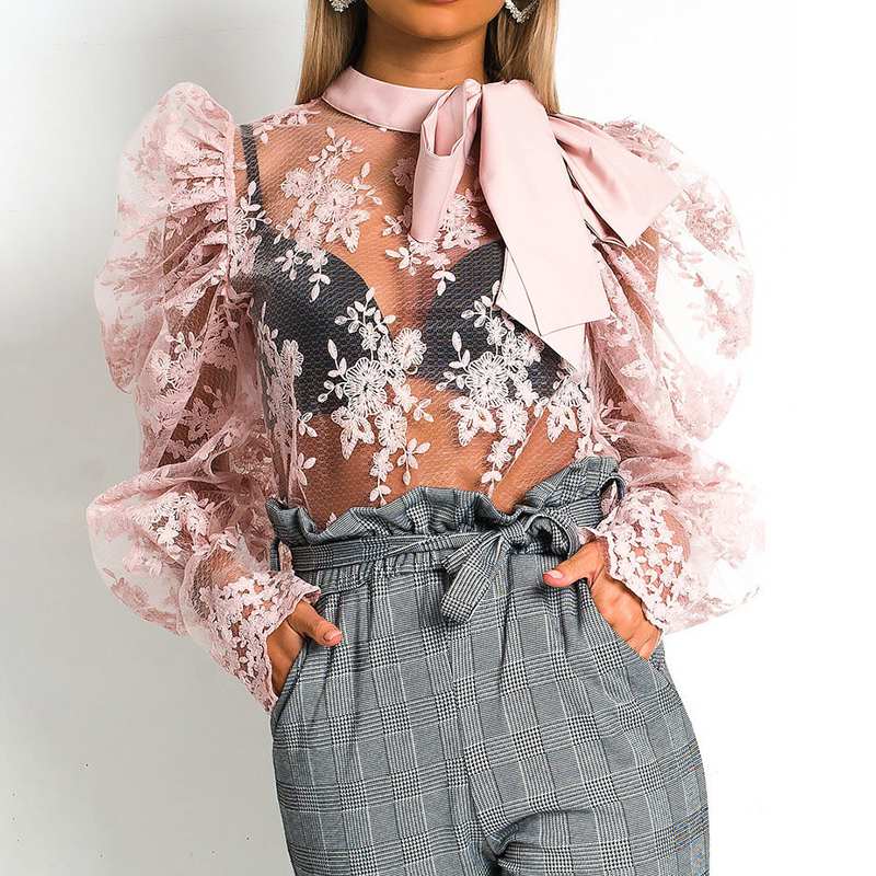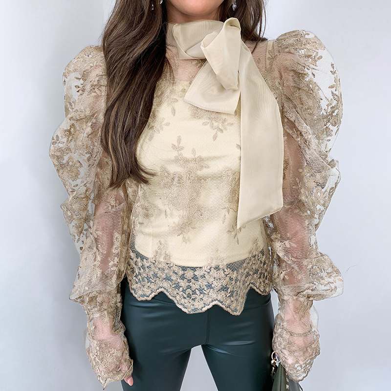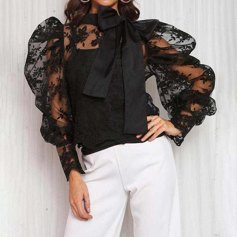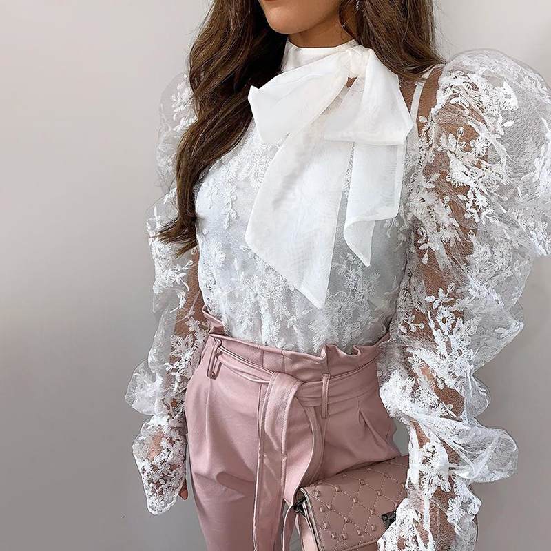 ZANZEA Summer Sexy Lace Blouse Elegant Women Long Puff Sleeve Lace Crochet Tops Bow Tie Shirt Femme Robe Party Blusas Chemise