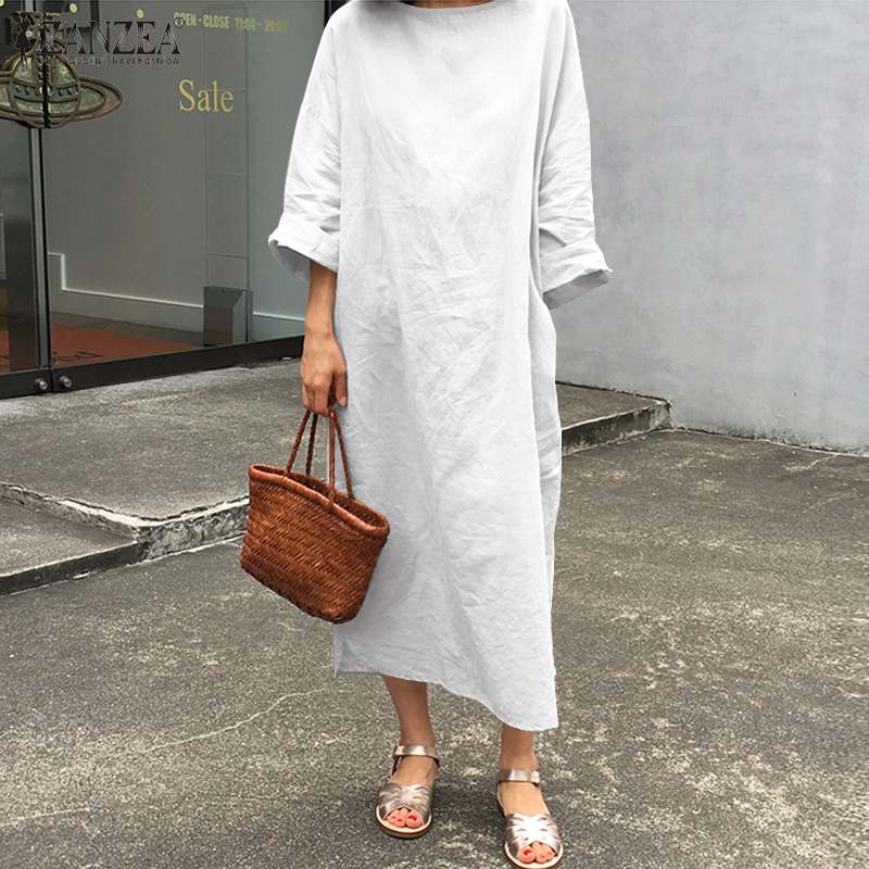 ZANZEA Women Cotton Dress Spring O neck Long Sleeve Casual Sundress Elegant Solid Party Vestidos Kaftan Dresses