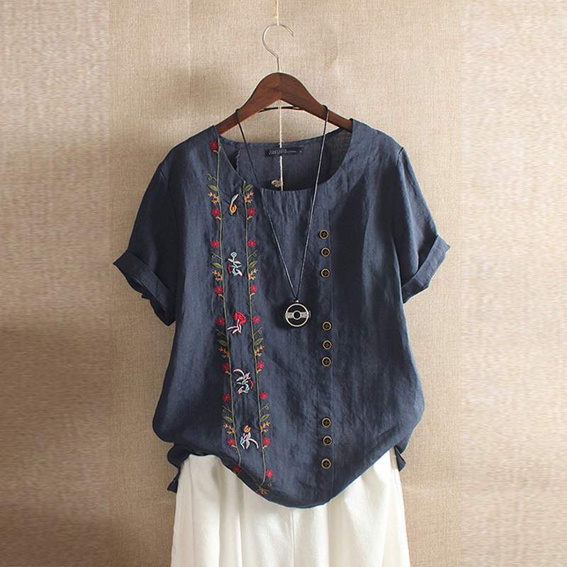 ZANZEA Women Cotton Linen Blouse Summer Short Sleeve Shirts Vintage Floral Embroidery Tunic Tops Casual Female Blusas Chemise