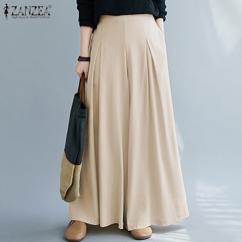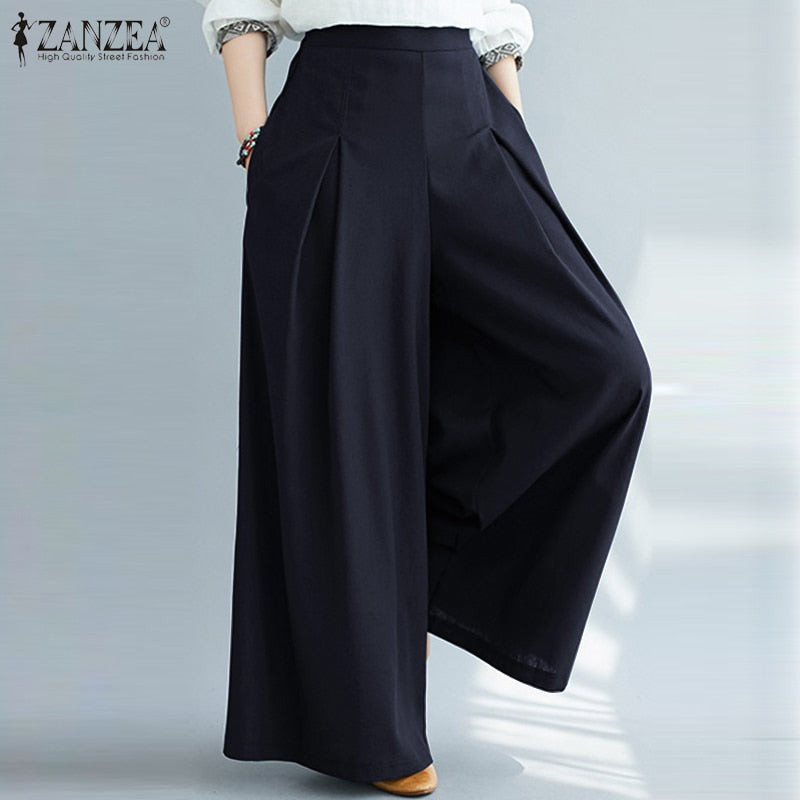 ZANZEA Women Elastic Waist Wide Leg Pants Loose Autumn Trousers Culottes Elegant Office Ladies Casual Palazzo Work Pantalon