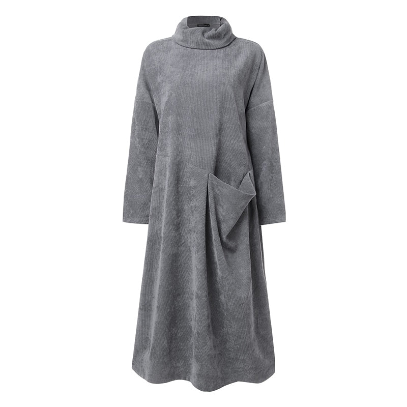 ZANZEA Women Turtleneck Long Sleeve Corduroy Dress Autumn Vintage Solid Long Sundress Baggy Vestido Kaftan Dresses 7